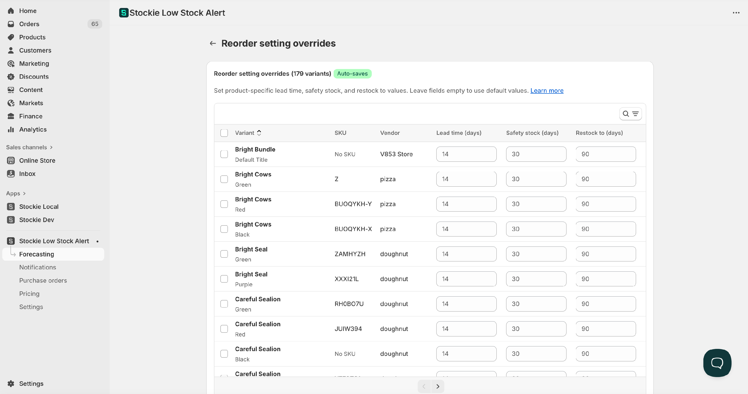 Simply edit the Lead time, Safety stock, or Restock to fields directly in the table — Stockie auto-saves your changes instantly.