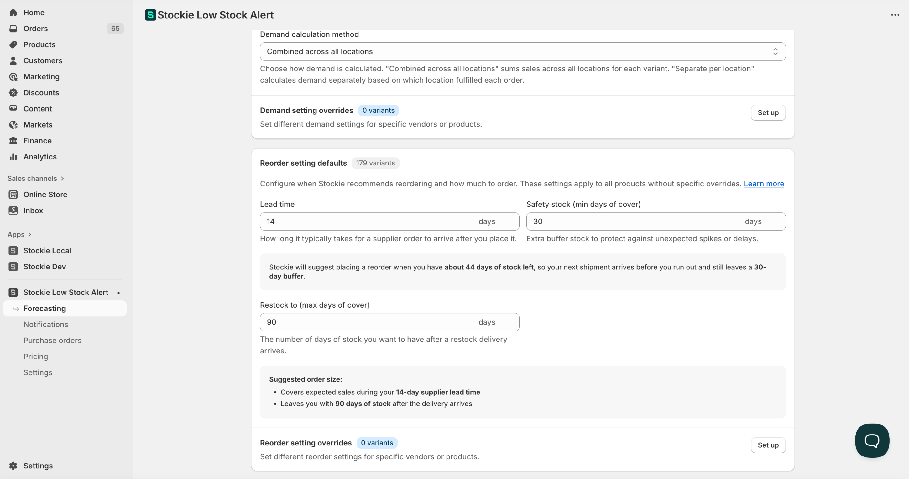 | Default restock to | The maximum number of days of inventory you want to have after restocking. Stockie uses this to calculate your suggested reorder quantity. | If you want to restock to 90 days of cover after each order, set this to 90. |