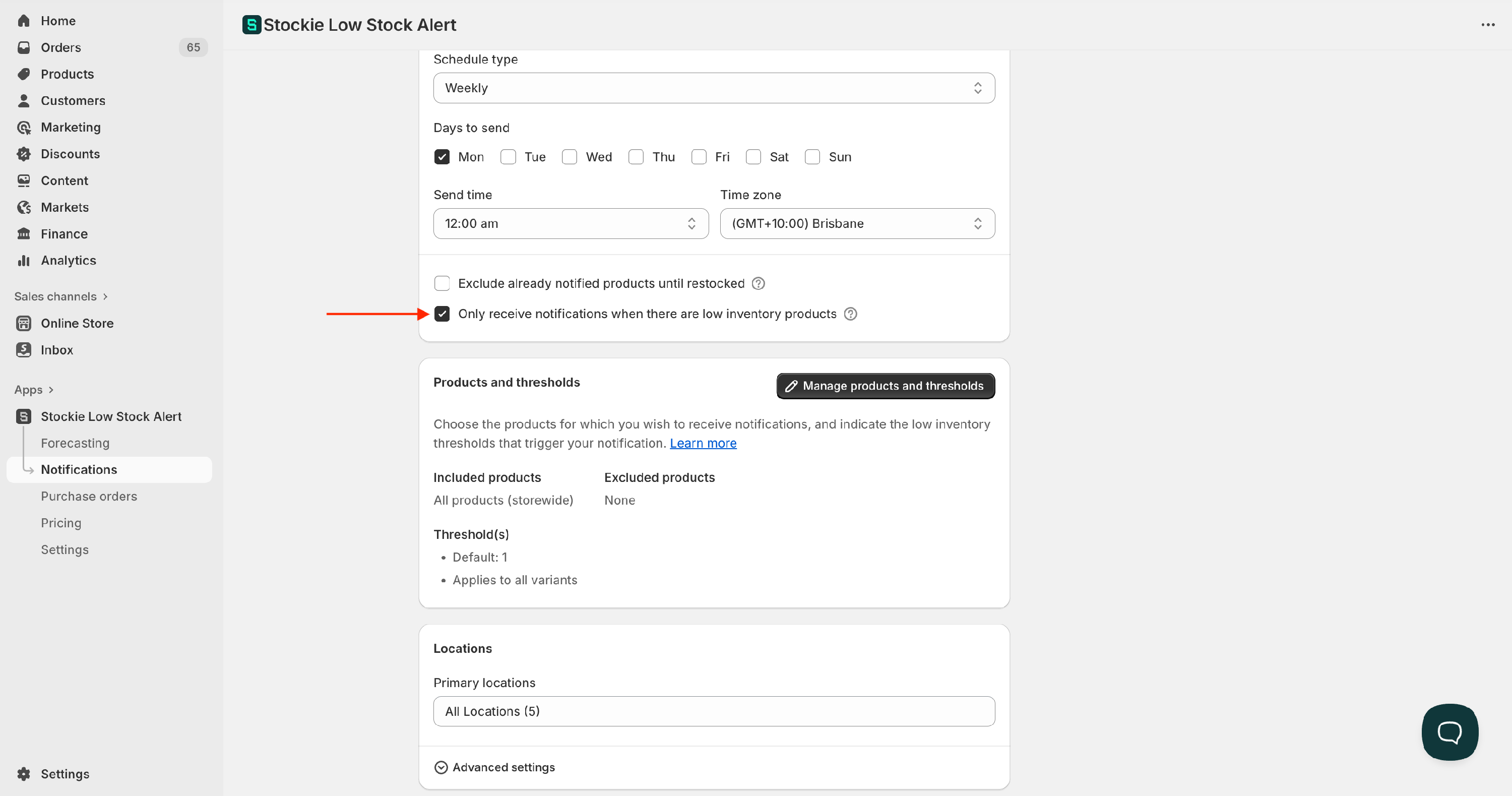 - Check the box next to: ✅ Only receive notifications when there are low inventory products