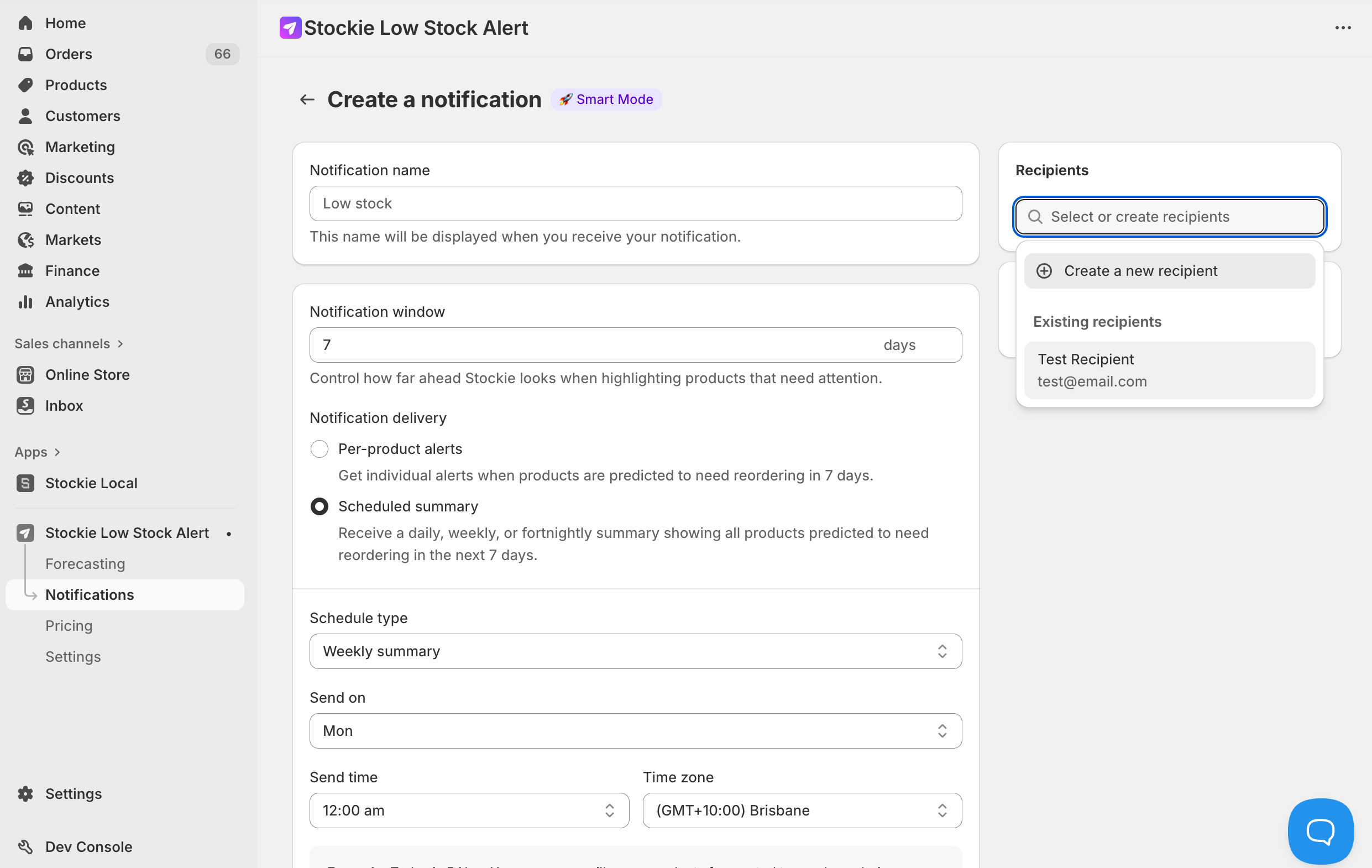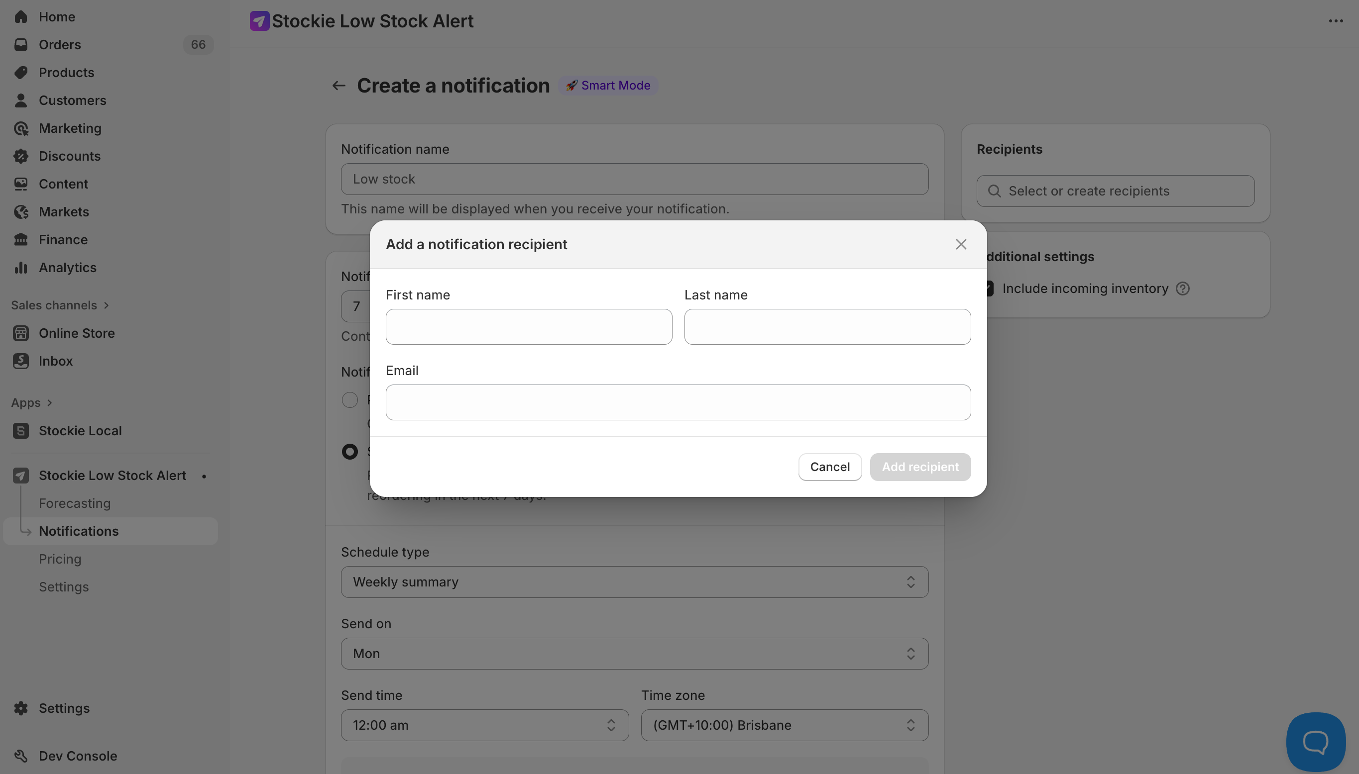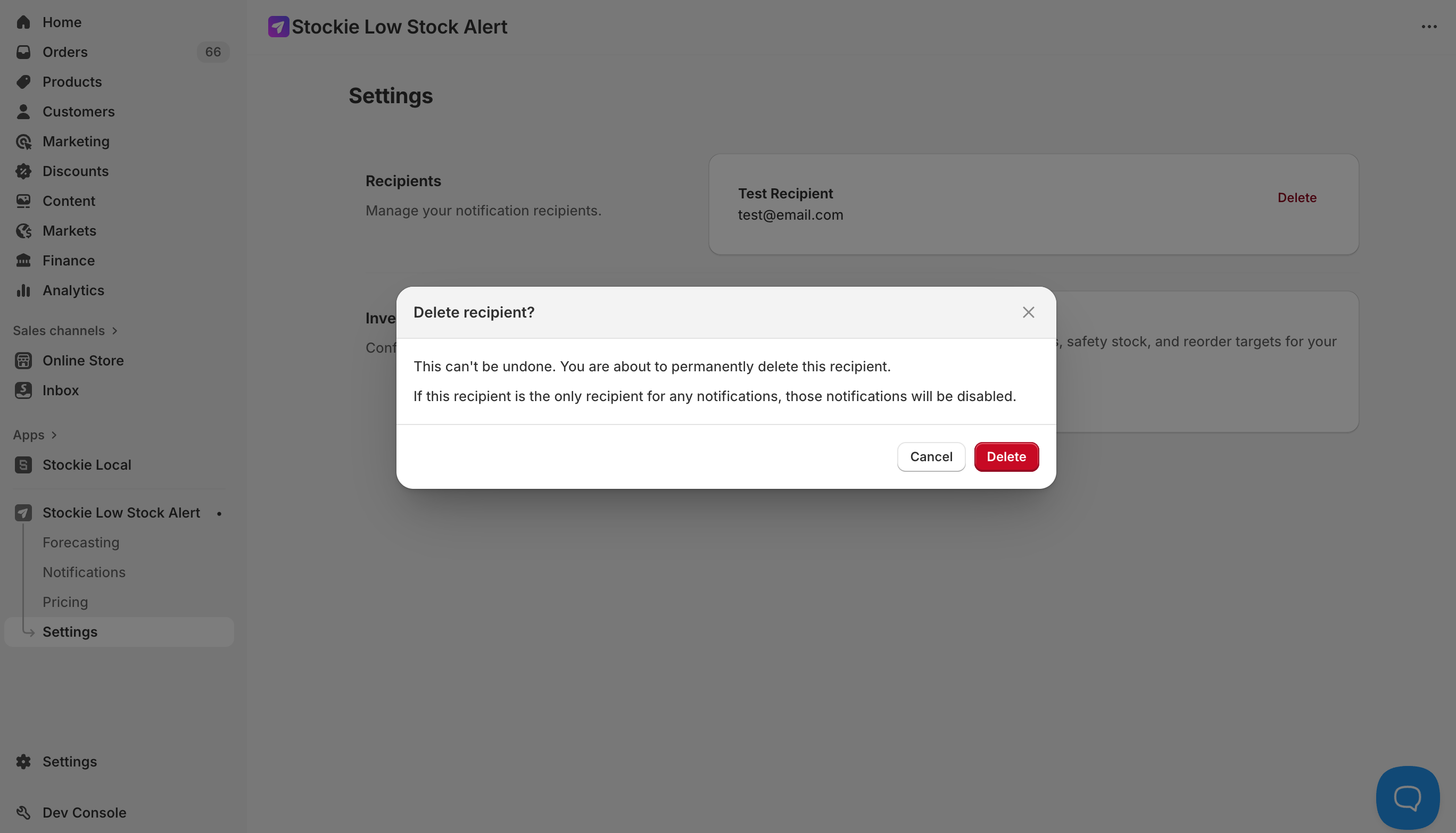 Recipients determine who receives your Stockie notifications. You can add, edit, or delete recipients at any time. Each recipient will receive the same email or message for any notifications they’re added to.