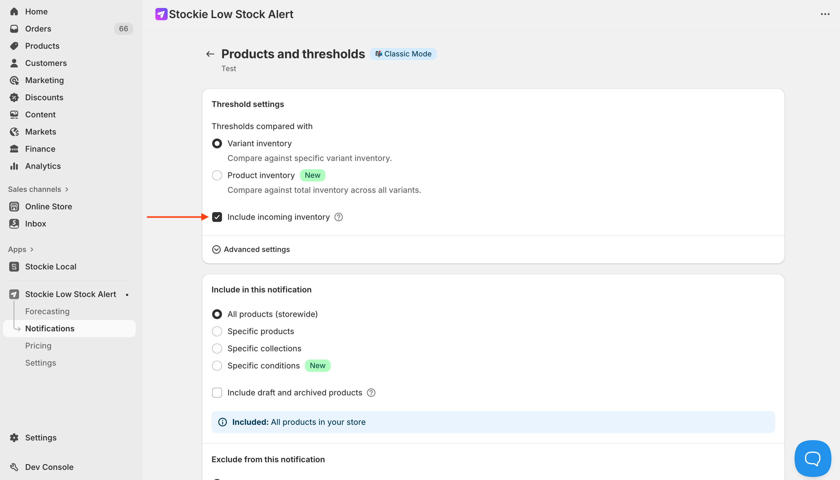 - Under Threshold settings, check or uncheck the box labeled: ✅ Include incoming inventory