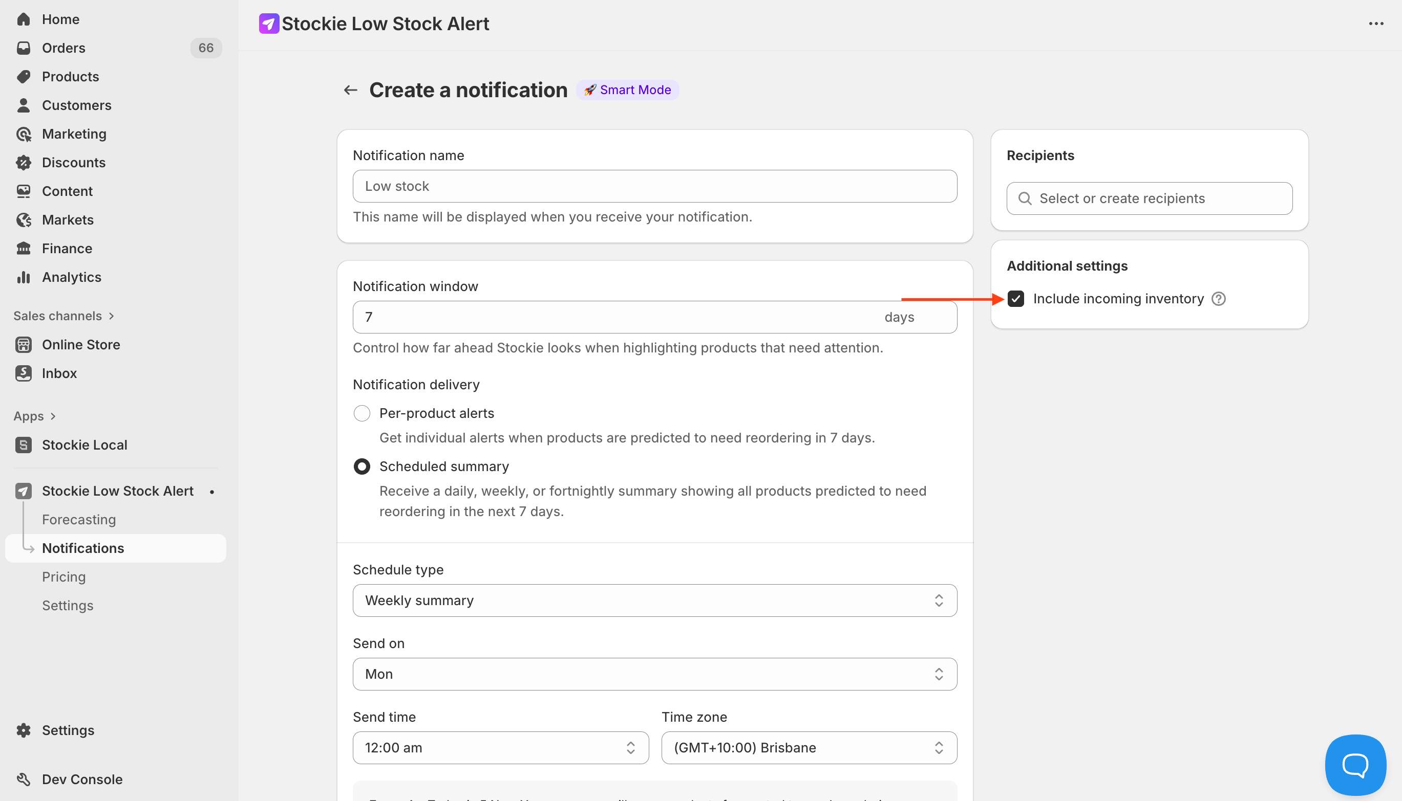 However, if you enable the Include incoming inventory option, Stockie will also count any stock that’s currently marked as incoming in Shopify — such as items on active purchase orders or transfers between locations.