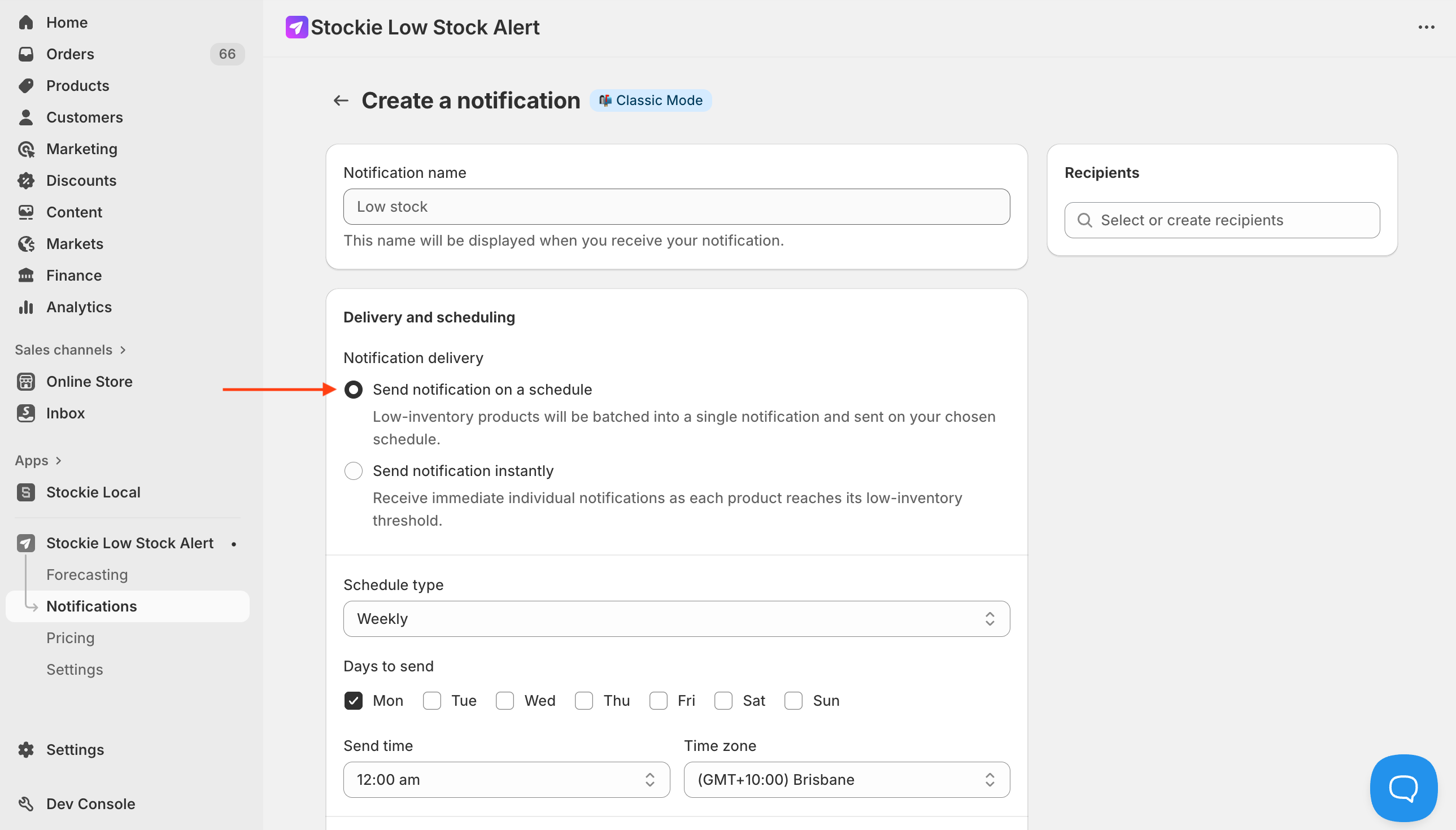 Stockie gives you two ways to receive low stock notifications — instant and scheduled.
