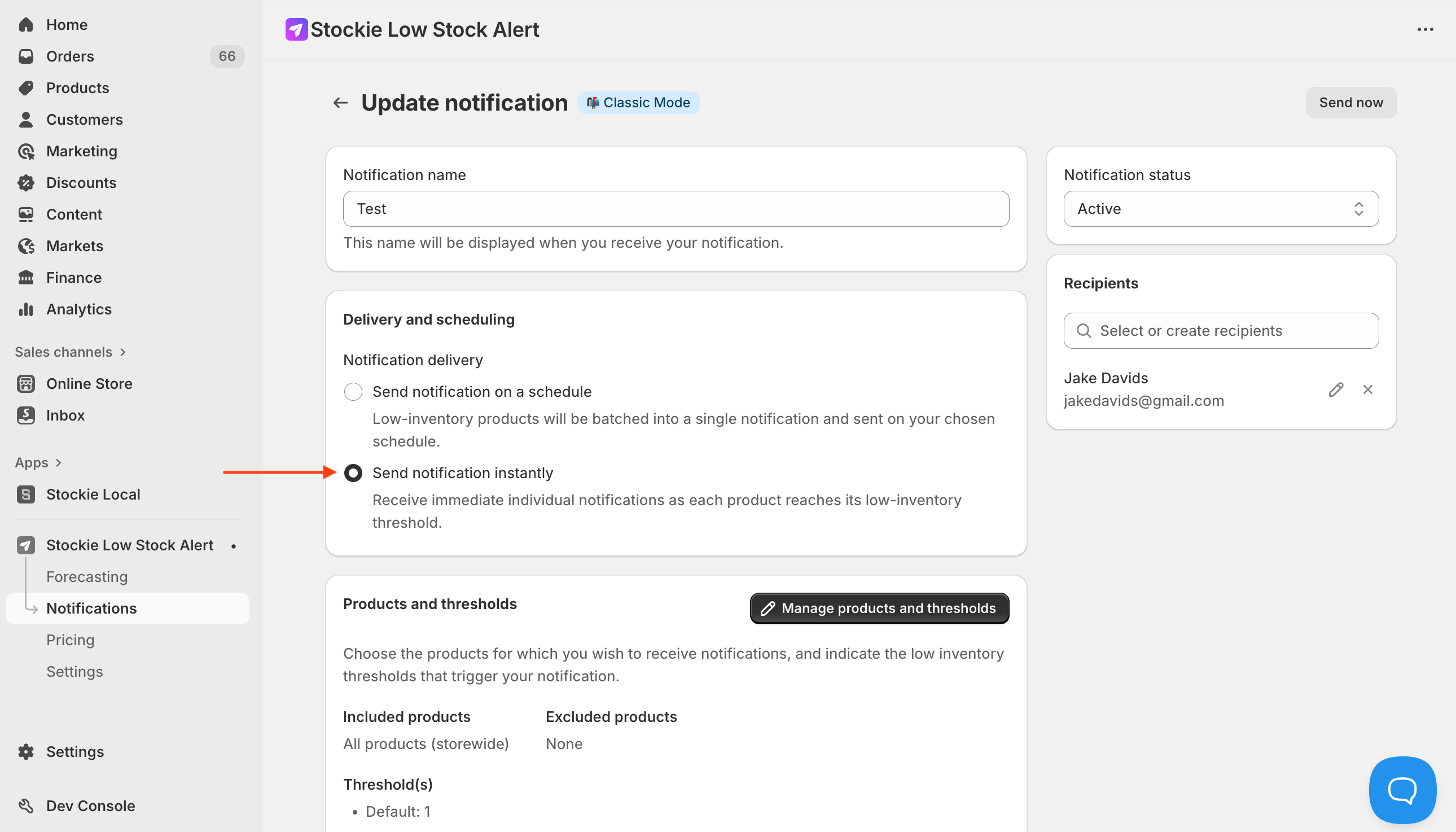 💡 Tip: Many merchants use both instant and scheduled notifications together — instant alerts for fast-moving or critical items, and a daily scheduled email for a complete inventory overview.