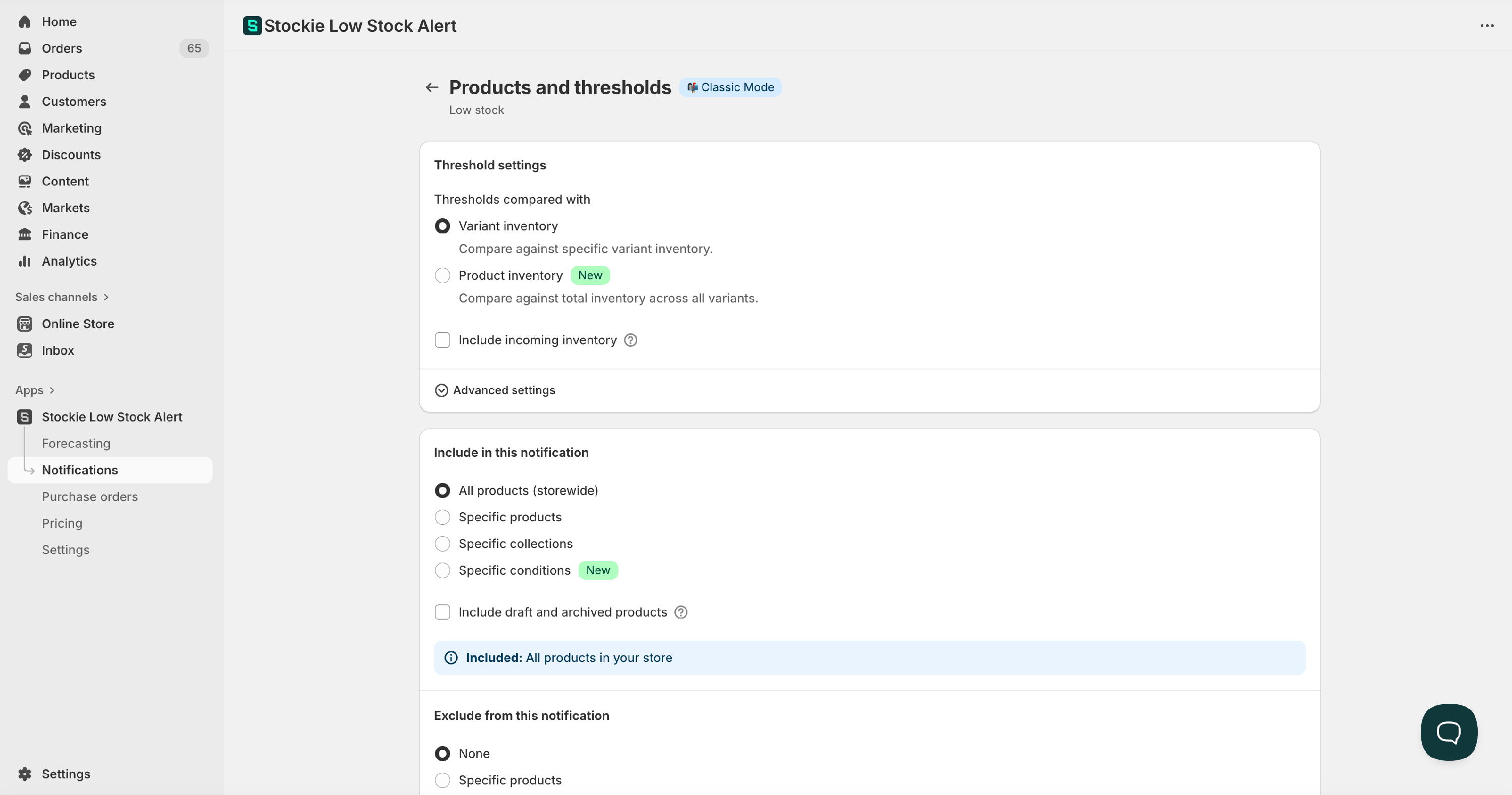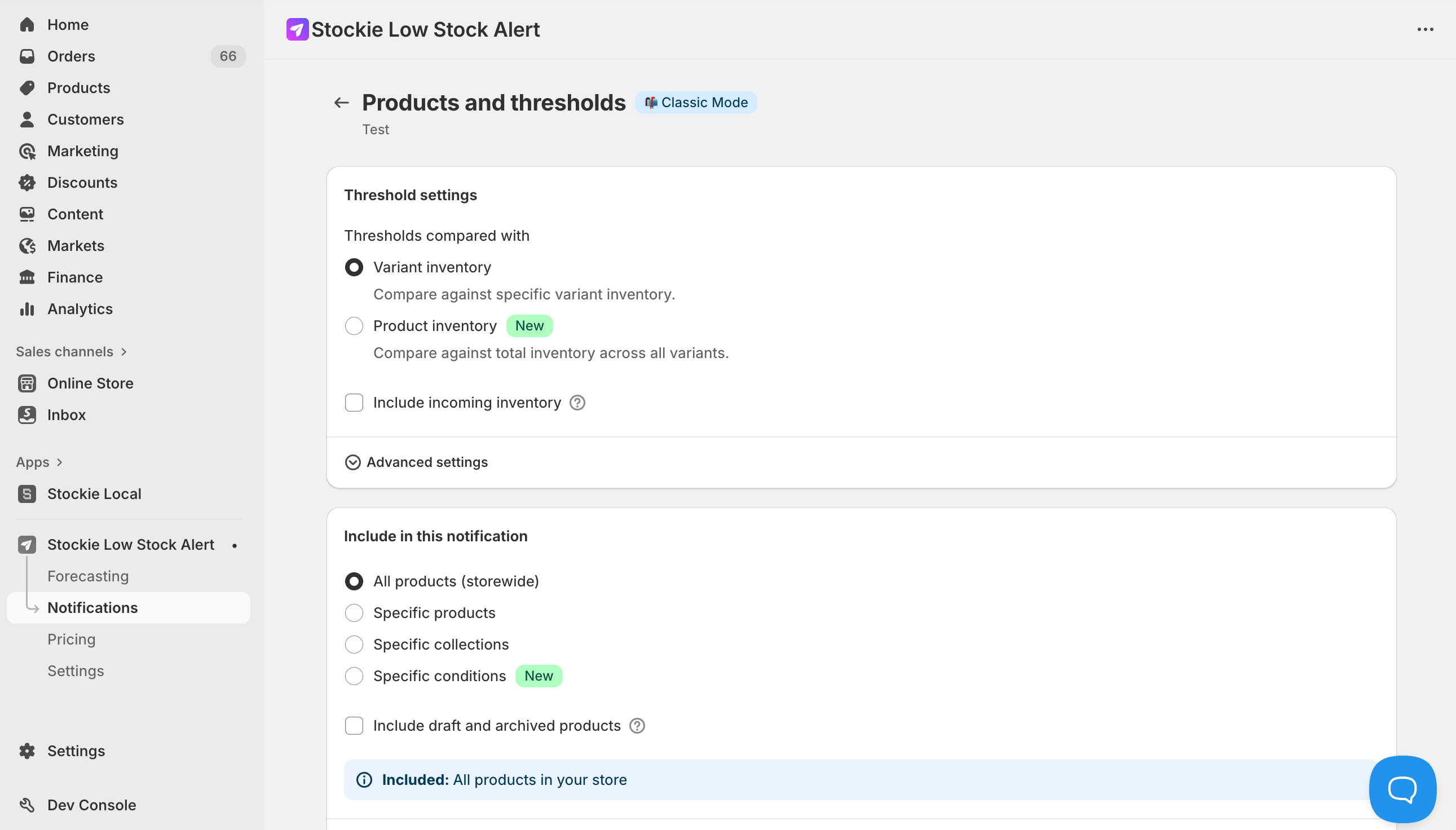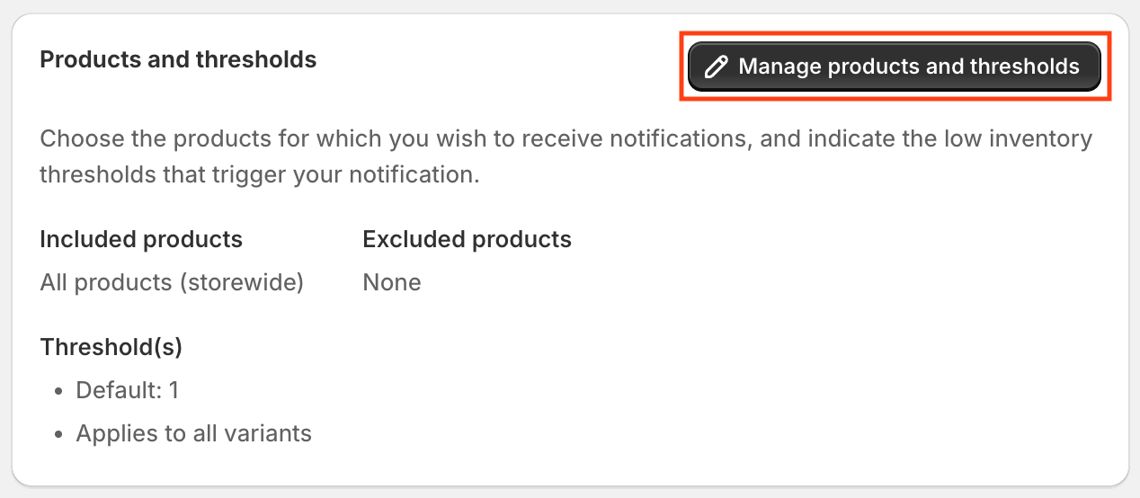 Once you’ve created a notification, you can choose which products it monitors and set your low stock thresholds.