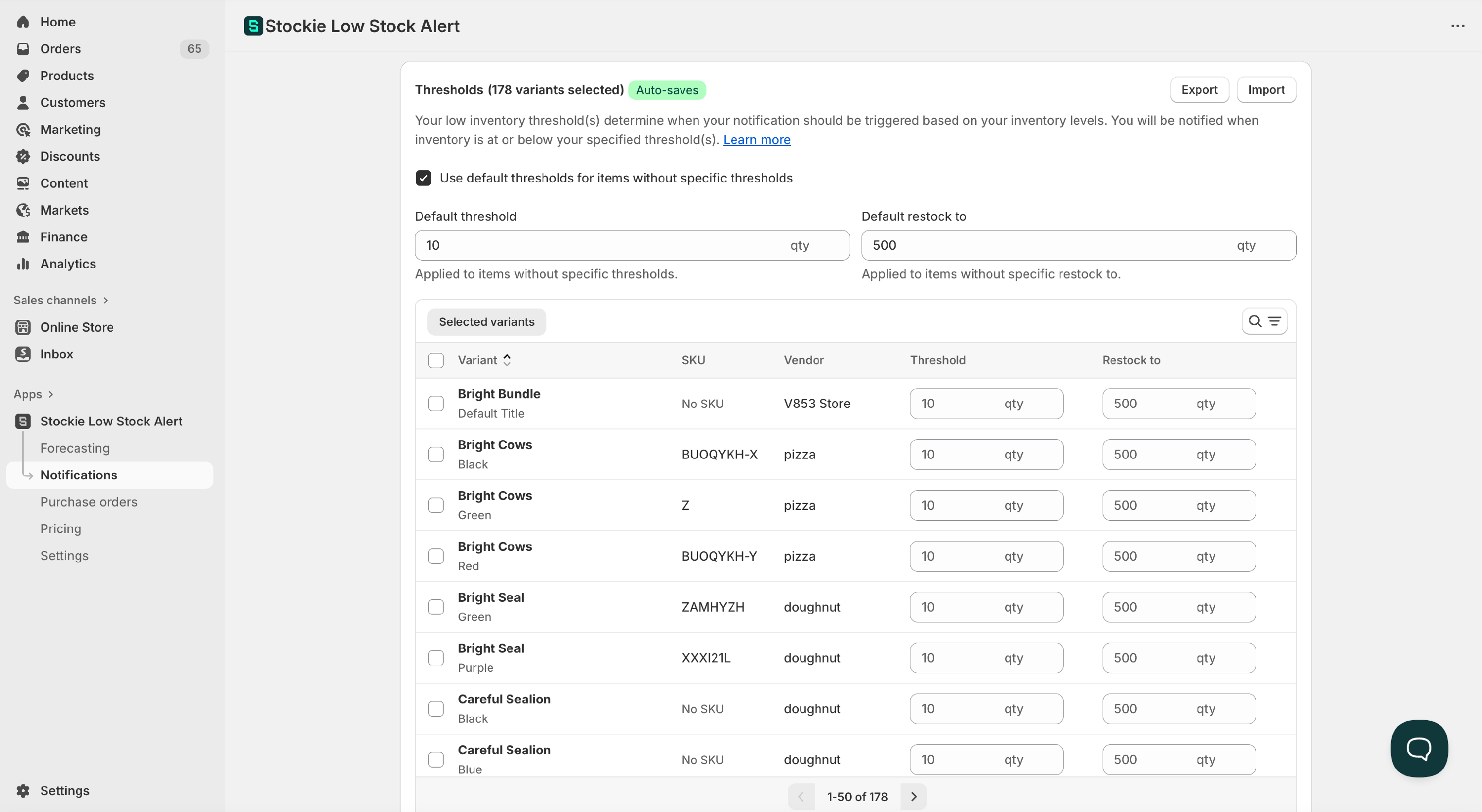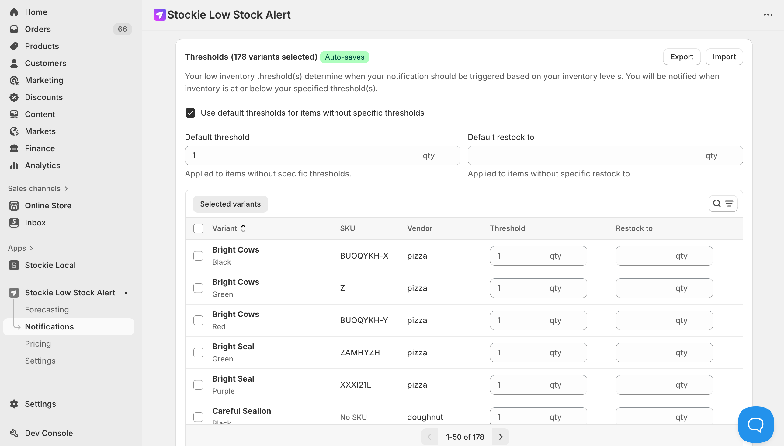 At the top of the card, you can choose to apply a default threshold and default restock to value to any variants that don’t have specific settings.