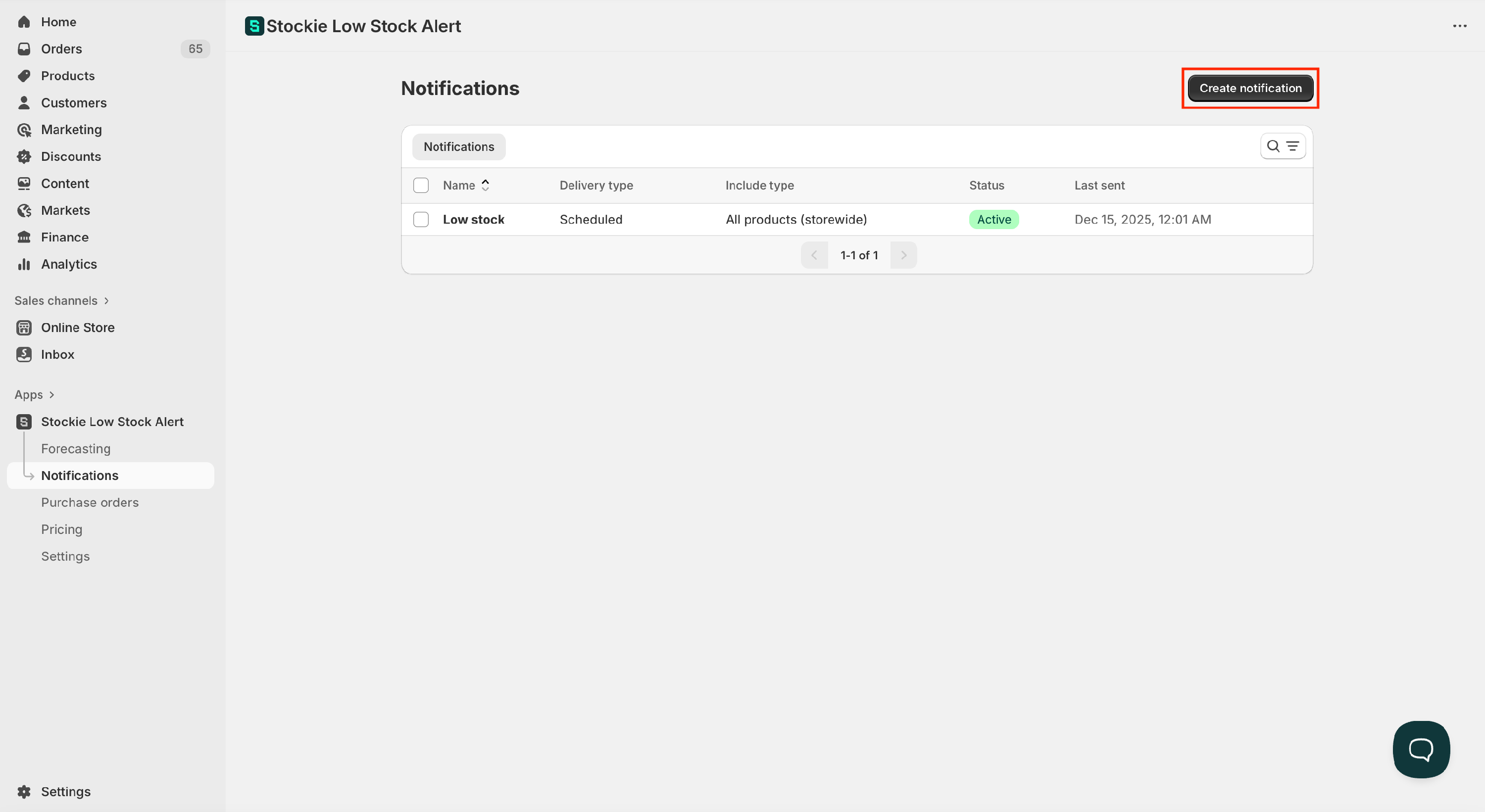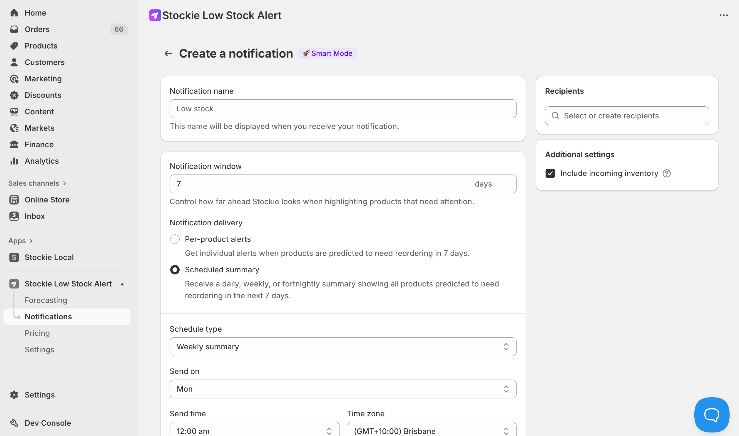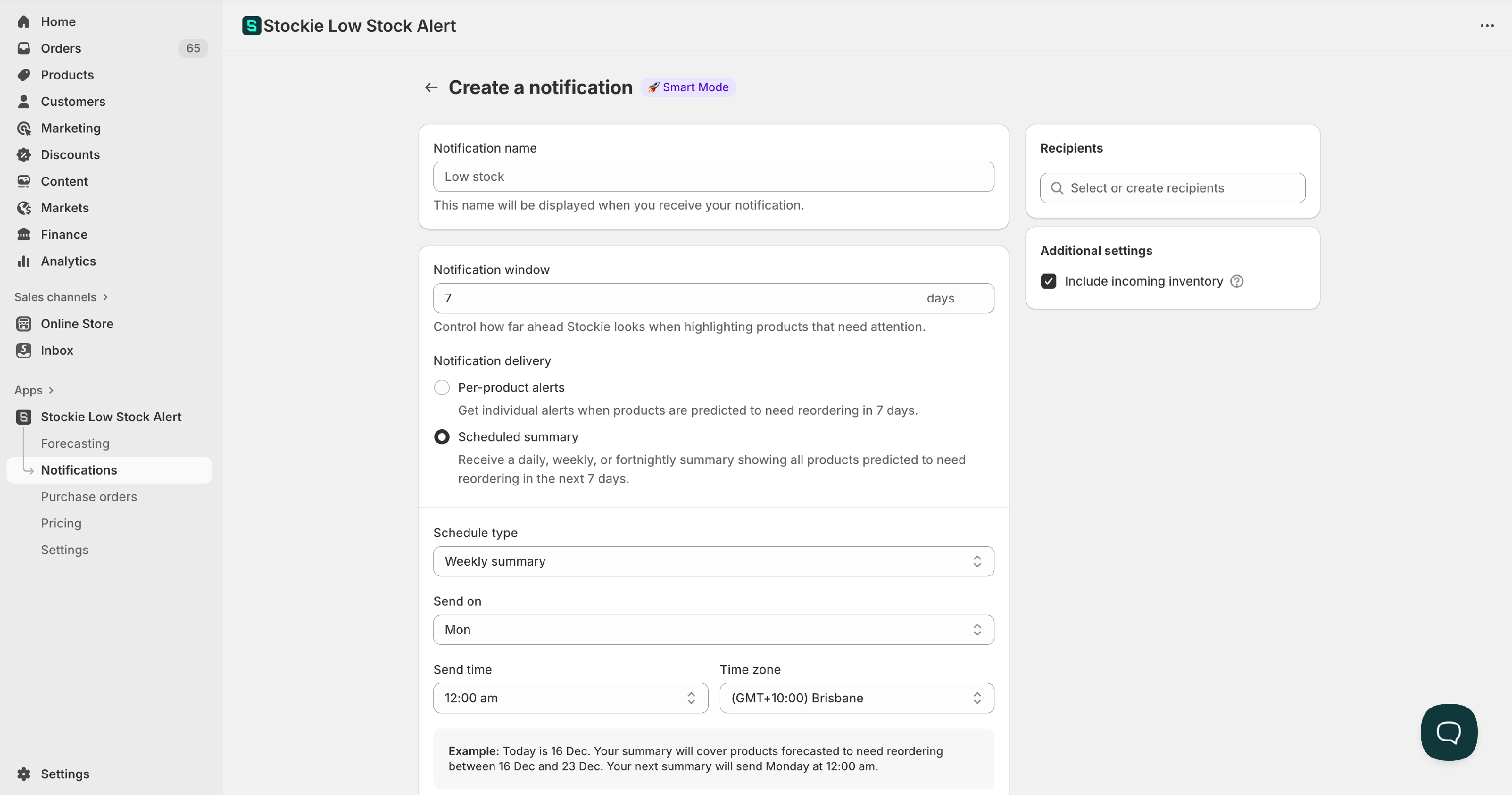 Smart mode notifications automatically use your inventory forecast to determine which products are low in stock.