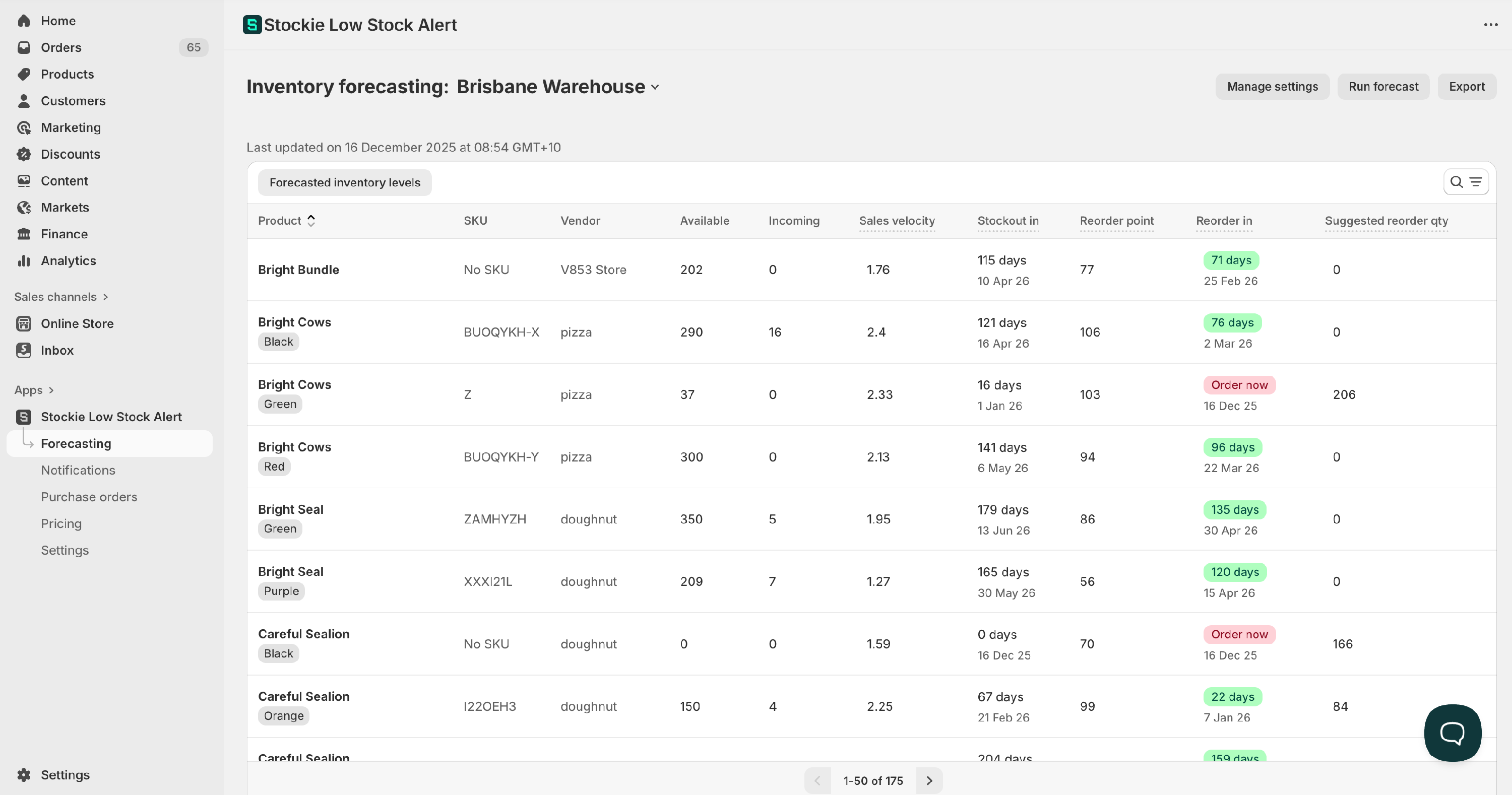 - Products appear alongside their forecasted Reorder in and Suggested reorder qty metrics for quick decision-making.